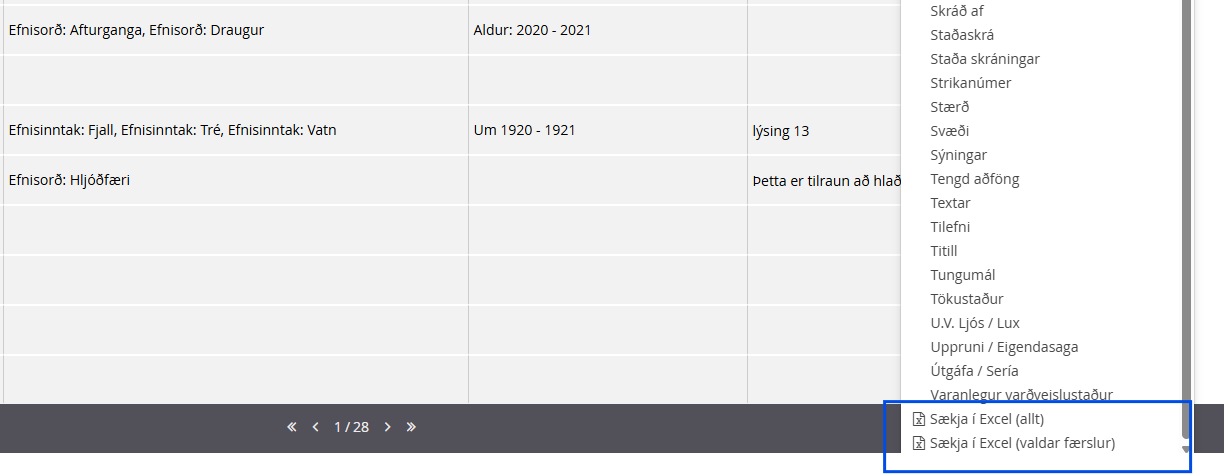 - Úr valmyndinni í töflusýn: opnaðu valmyndina og skrollaðu neðst í listanum. Veldu hvort á að flytja út allar færslur úr niðurstöðunum eða aðeins valdar færslur - þ.e. þær sem smellt hefur verið á og eru bláar.