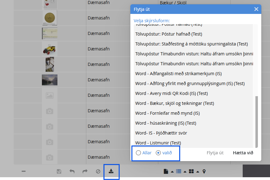 - Nú getur þú valið fyrirframskilgreint skýrsluform til að fytja út, annaðhvort fyrir eina færslu eða margar (valdar)