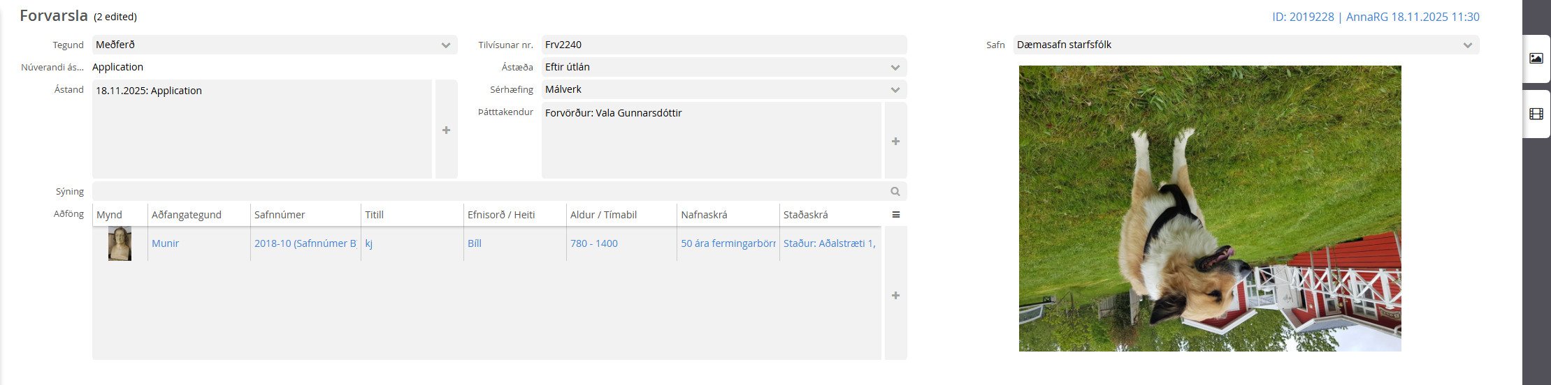 Forvörslueiningin er notuð til að meta ástand, skrá meðferðir og tengja myndefni/skjöl við gripi – hvort sem er í tengslum við sýningar, samninga eða almenna forvörslu. Muna að hluti ástandsupplýsinga er tiltækur á aðfanginu sjálfu (Aðföng → flipar „Ástand“ og „Meðhöndlun“); ítarlegt ferli og skýrslur eru unnin í Forvörslu.