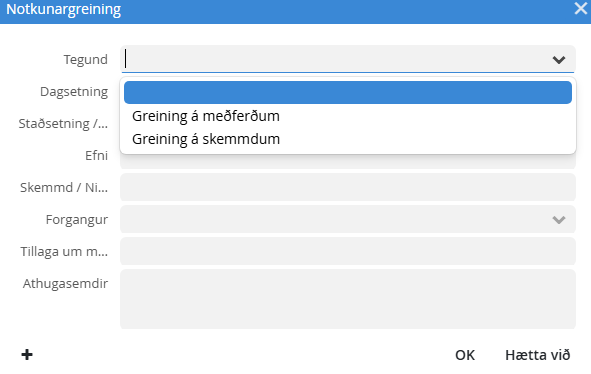 Undir „Tegund“ eru núna í kerfinu tveir valmöguleikar: greining á meðferðum og greining á skemmdum. Hægt er að breyta og/eða bæta við þennan lista.