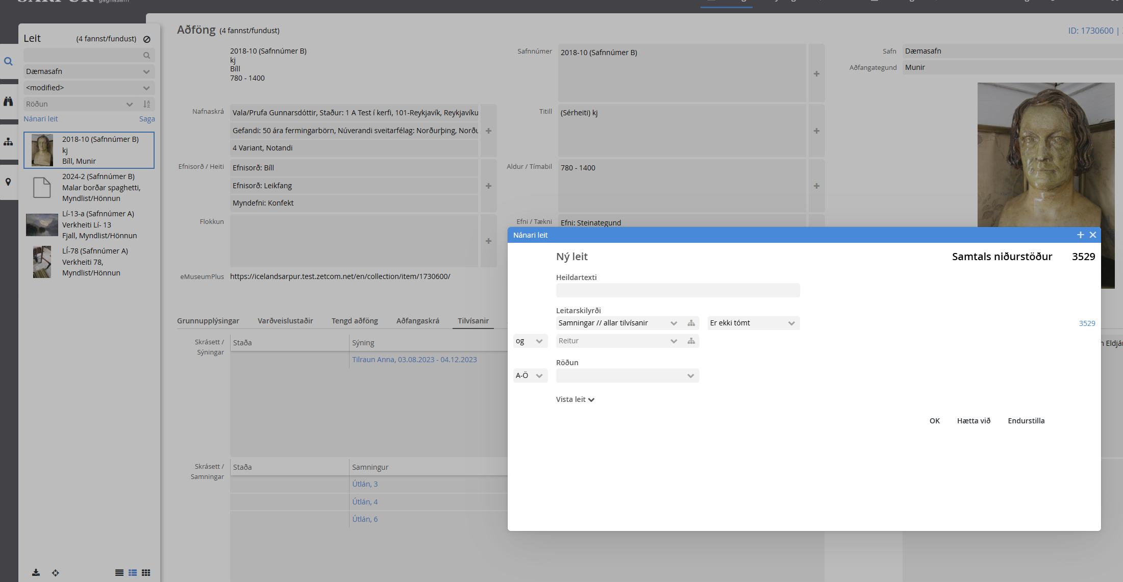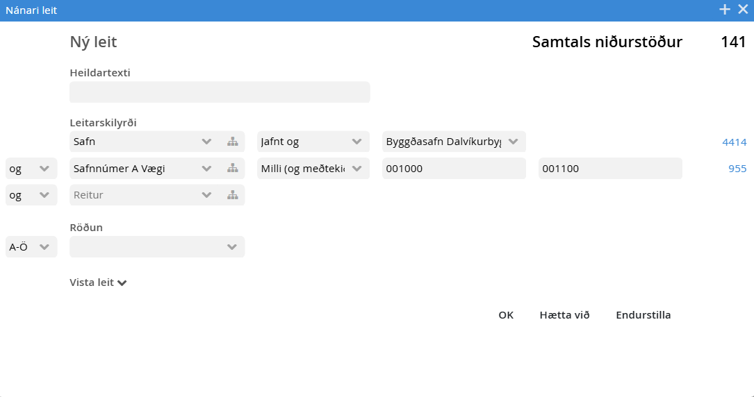 Til að leita eftir safnnúmerum er best að nota reitinn Safnnúmer A / B vægi. Reiturinn þarf að innihalda sex tölustafi, þannig að bæta þarf „0“ fyrir framan eftir því hversu háar tölur er verið að vinna með.