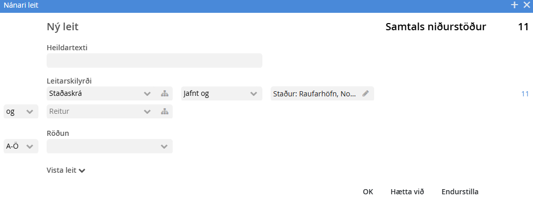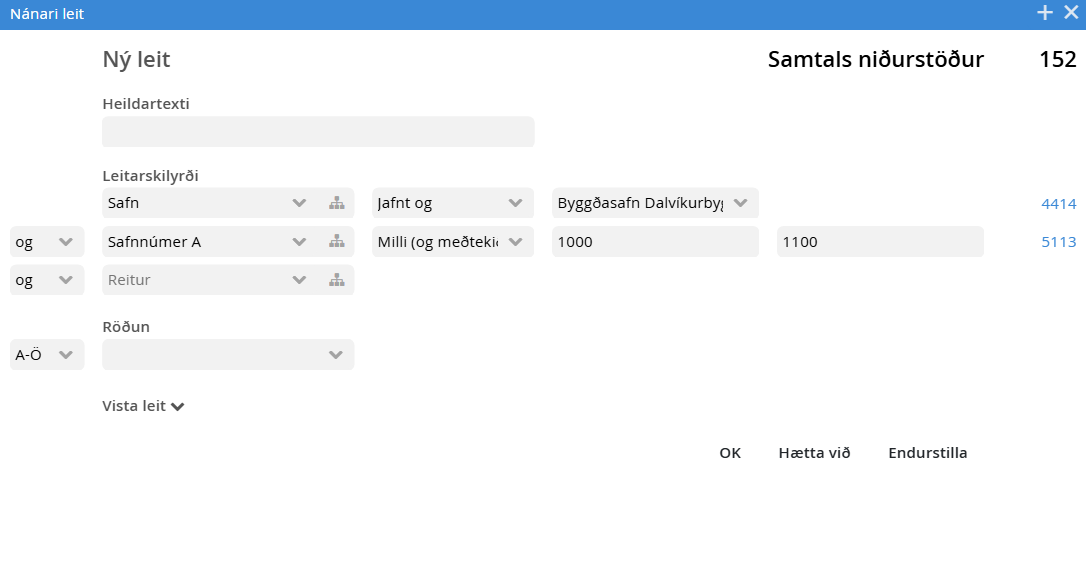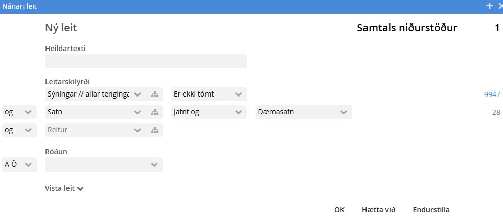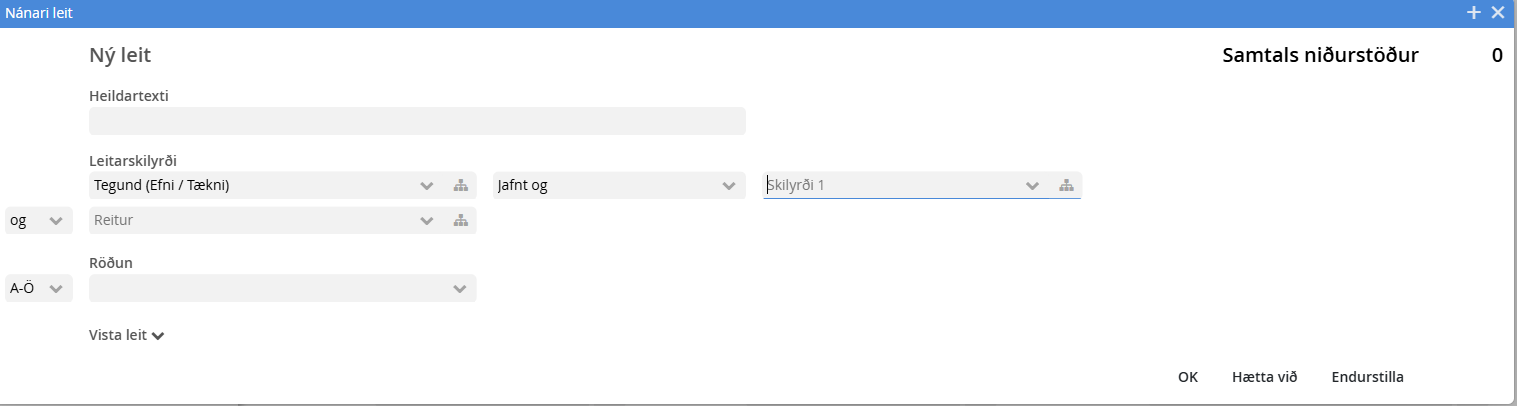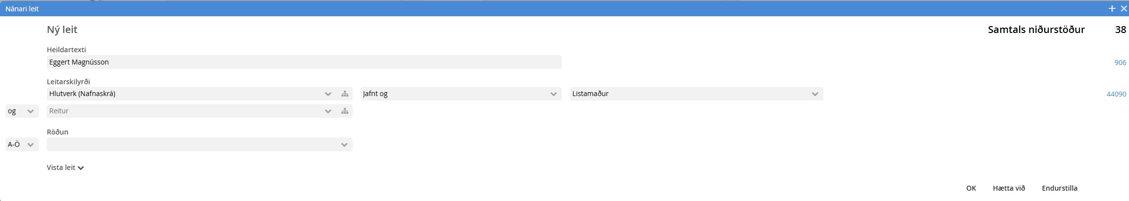 Hér koma dæmi með skjámyndum hvernig er best að leita að ákveðnum leitarskilyrðum. Smelltu á dæmin til að opna eða loka.