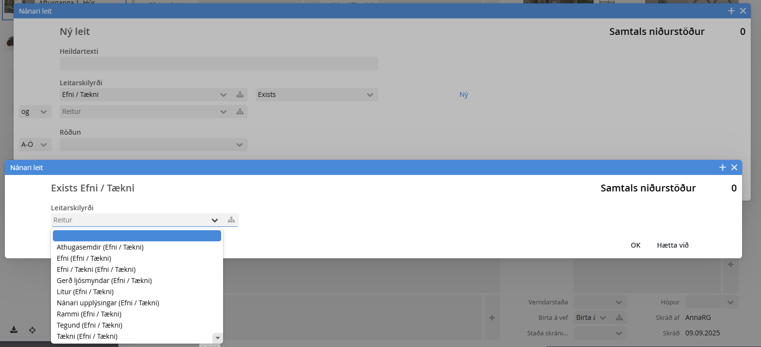 Ef valið er í leitarskilyrðum Efni / Tækni birtist sjálfkrafa „exists“. Smelltu á ný.