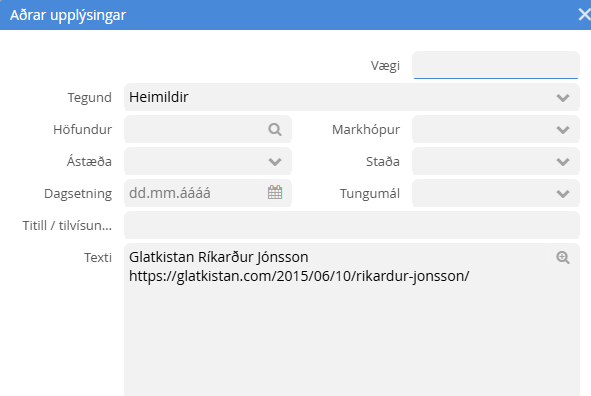 Undir aðrar upplýsingar er tegund Heimildir. Ef það er tengill hér þá birtist hann virkur.
