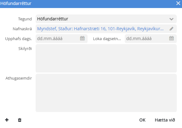 Ef hnit eru skráð í reitinn Hnit. Ef engin hnit eru skráð en Staður er til í Staðaskrá þá birtist staðurinn á korti.