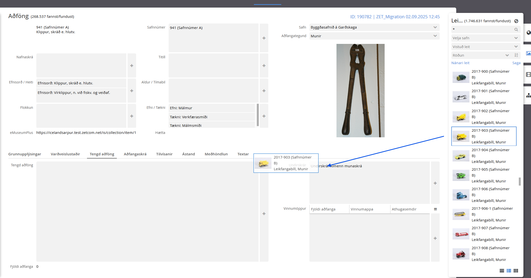 Veldu tegund. Athugið þessi listi er ekki tæmandi og möguleiki að bæta við sé þess óskað. Hægt er að leita eftir aðfanginu og er best að nota safnnúmerið. Einnig er hægt að fara í hægri flipann, undir aðföng og draga aðfangið í gluggann.